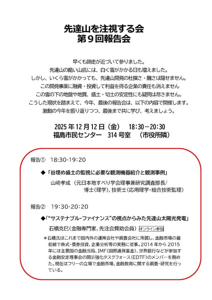 本会は、福島市の先達山で行われているメガソーラー建設工事に対する憤りと疑念を共有し、