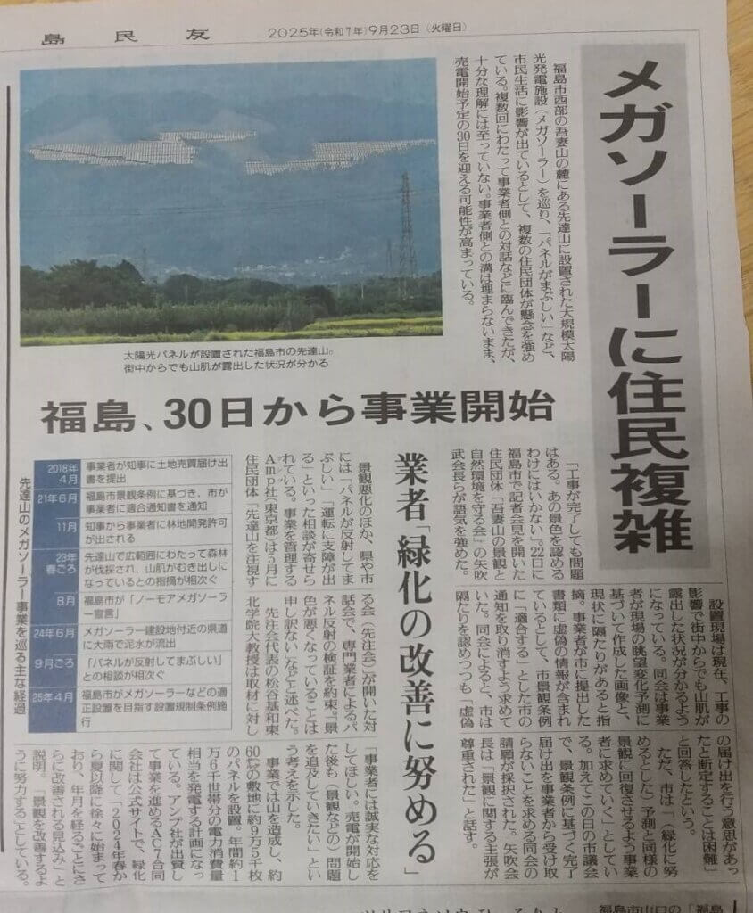 『福島民友』2025/9/23 メガソーラーに住民複雑