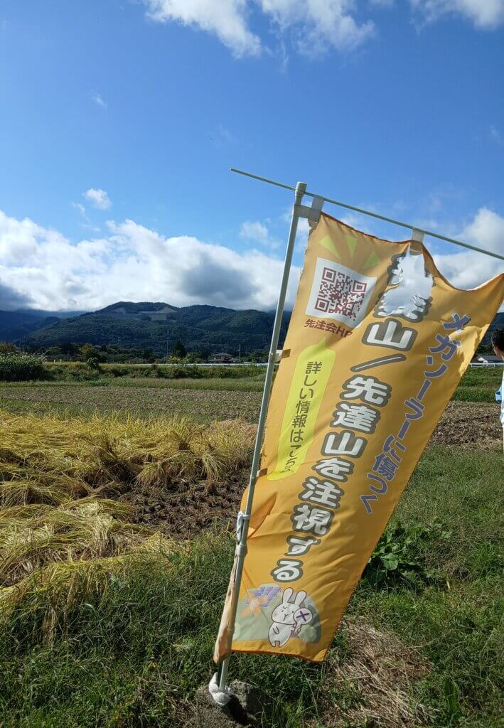 先達山を注視する会の賛同者・支持者は、市内各地の自己所有地に左のノボリ旗を掲げています。この旗は、先達山問題に関心を寄せ、「注視」している住民の存在と意思のシンボルのようなものです。