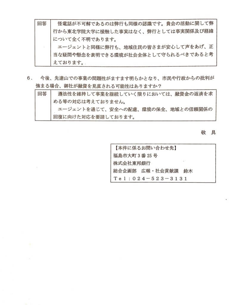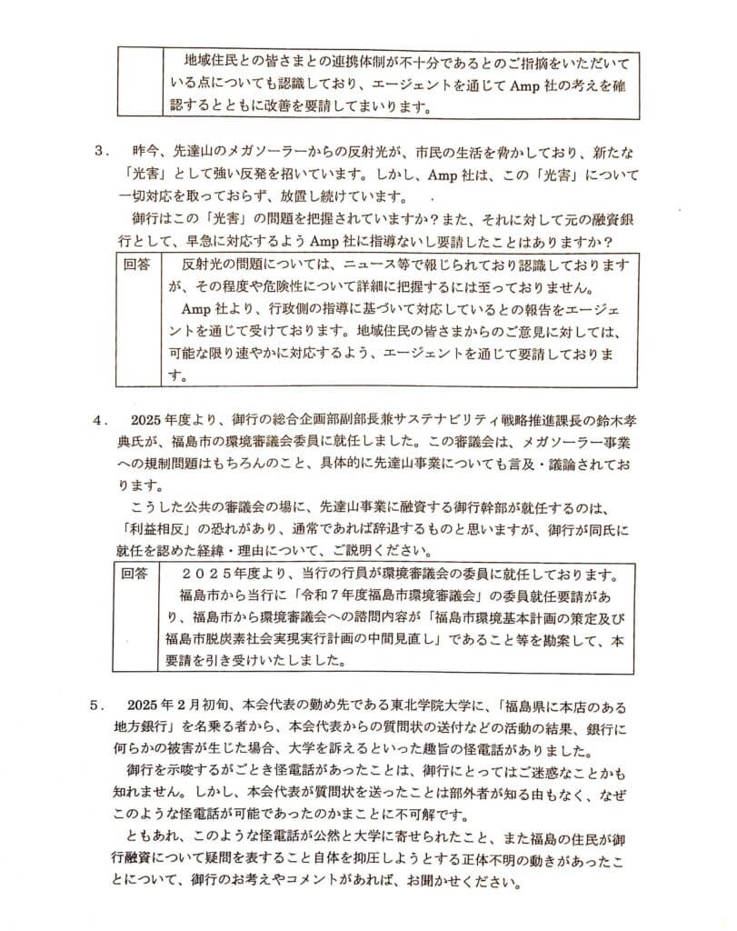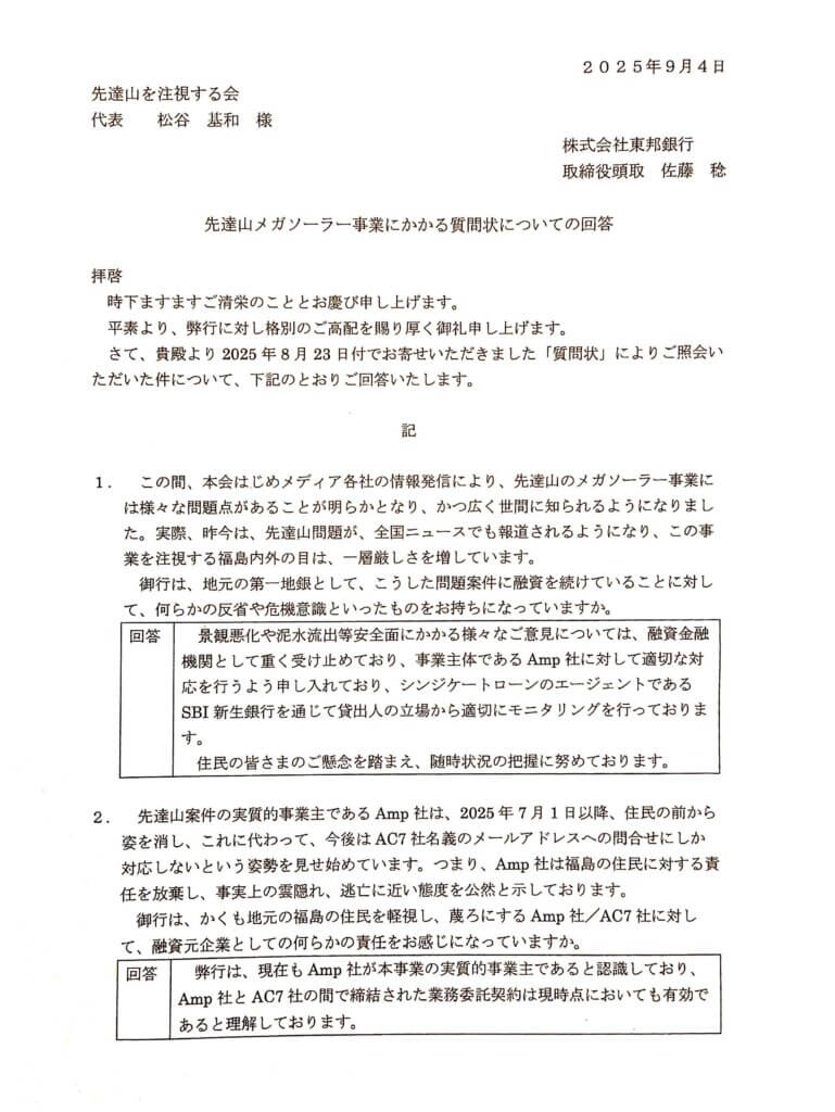 先達山発電所の売電開始が9月末と噂される中、東邦銀行は本会からの質問状に対して、以下のように回答しておりました。この内容を踏まえた上で、売電開始後に東邦銀行が、自らの立場をどのように変え、また弁明するのかにご注目ください(実際、売電開始後に東邦銀行から寄せられた回答[2025年11月20日付]はこちら)
