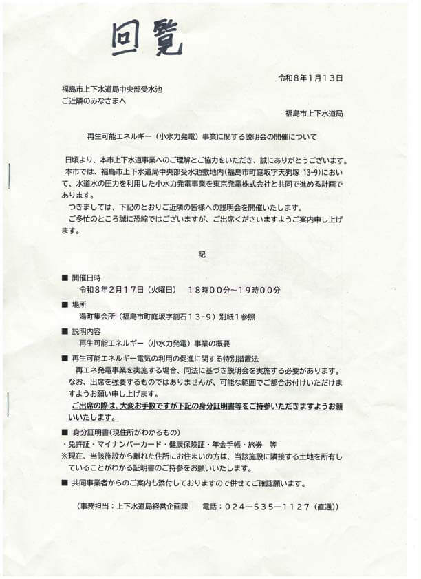 この回覧通知を見ただけで、正直、福島市水道局と東京発電なる会社が、福島市の水道施設を私物化しているように感じました。