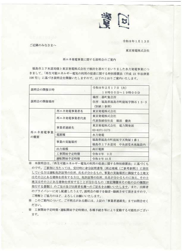 『ふくしま中央部受水池発電所の建設計画に関する事業者との協議録、その他関係資料』 [ポータルサイトにも掲載コーナー作りました