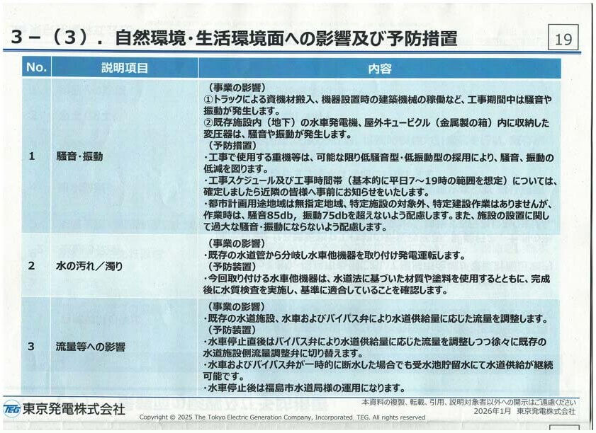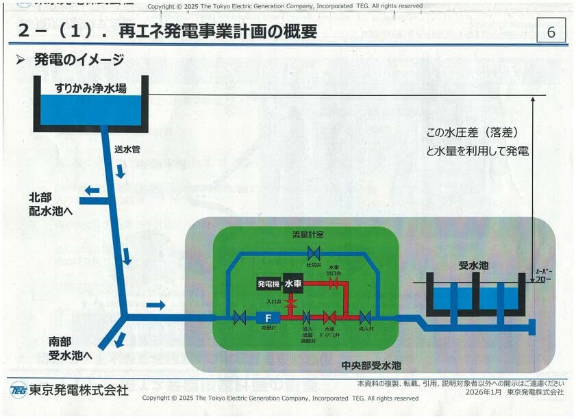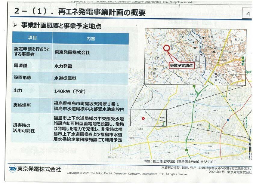 これもほとんどの福島市民が知らないことですが、実は福島市の水道局は、すでに2018年に東京発電に対して、北部配水池という別の水道施設(平野)において小水力発電事業を認め、稼働させていたのです。