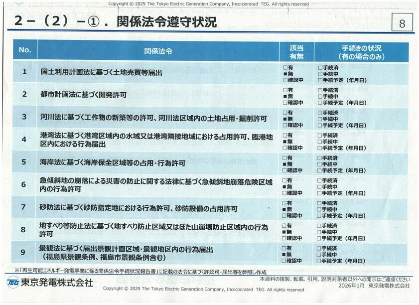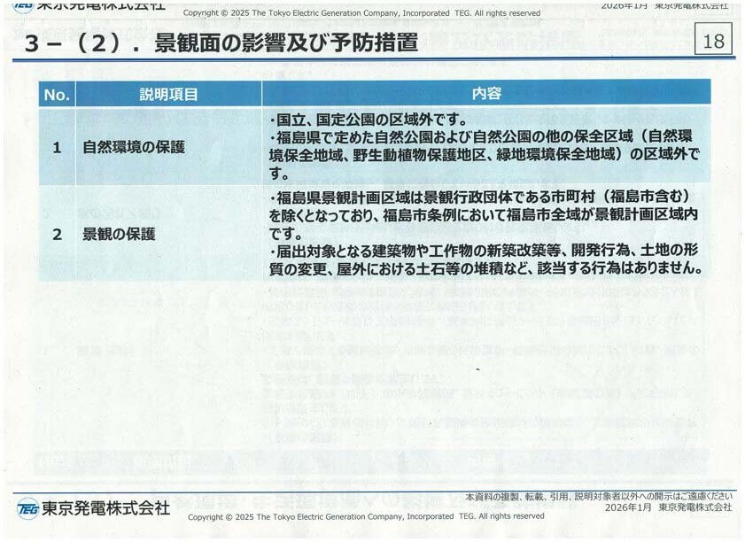 これを見て頂ければ、今回の説明会で市民・住民には示されなかった情報が何であるかを理解できるはずです。また、福島市が全面黒塗りしてまで市民に示したくない情報が多々あることも一目瞭然です。福島市の再エネ事業とはなぜこうも不透明で「黒・闇」が多いのか。市民だけでなく、メディアにも、この不可解な部分を追って頂きたいものです。