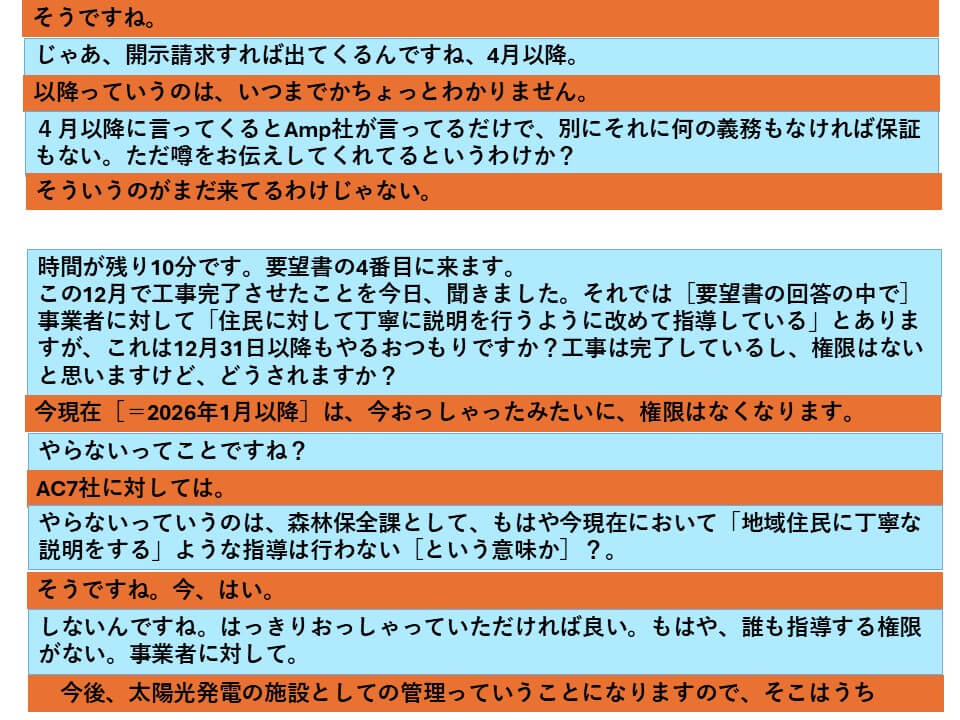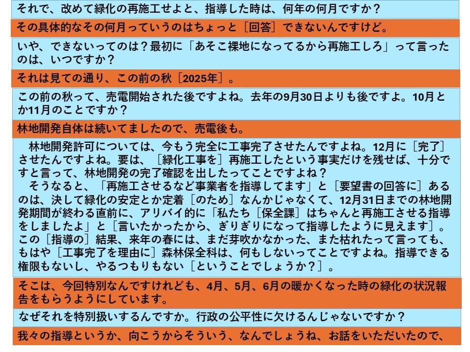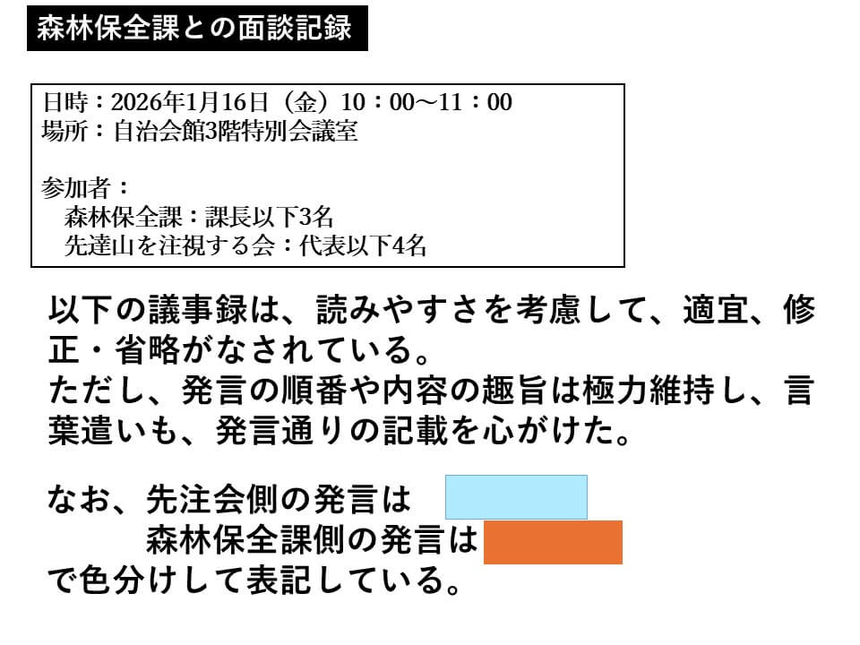 しかし、今回は、こうした福島県側の行政対応上の問題をさらに具体的に裏付ける資料として、去る2026年1月16日に、本会代表らが県の森林保全課と面談した際の会話録を公開します。この面談は、元々、本会が先に提出していた要望書への県側の回答(県知事宛要望書への森林保全課回答)内容が余りにも乏しく不誠実に感じられたため、県側の真意を確認すべく行われたものです。しかし、そのやり取りの過程で、我々の予想以上に、県側がこの開発許可に対する責任感に乏しく、工事完了を口実として、今後は事業者への指導も行わない方針であることを知りました。