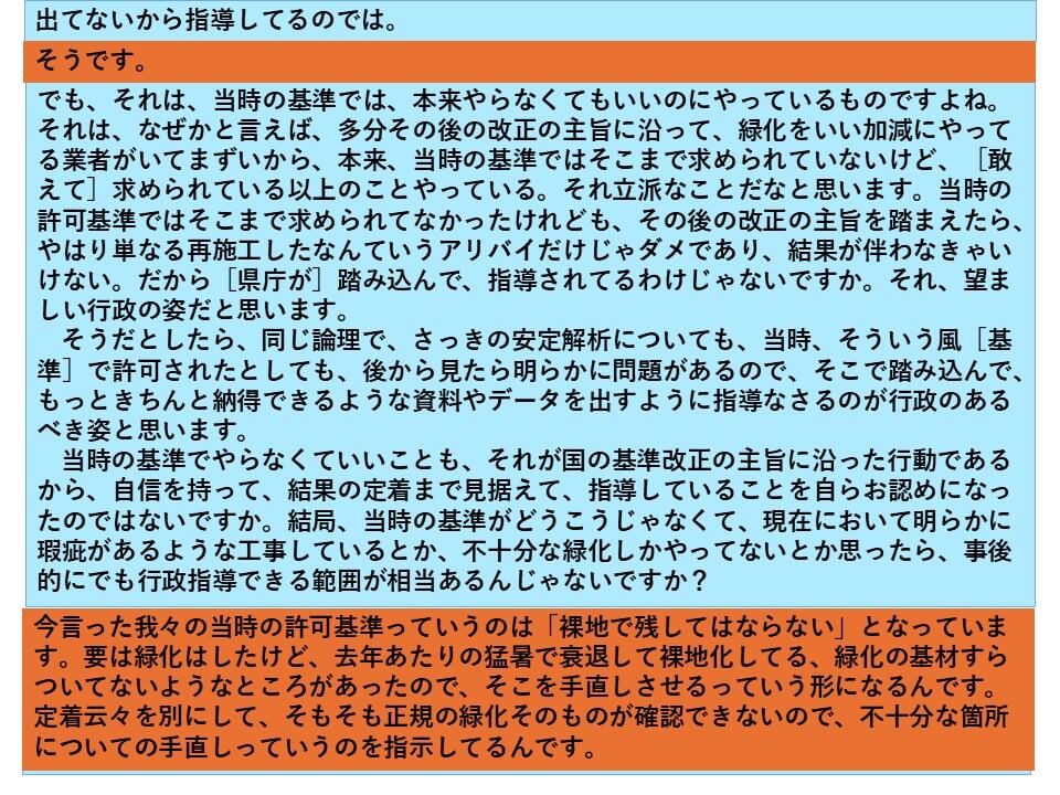 ということは、やはり旧基準で許可した案件であっても、緑化については、安全性にも関わる問題であり、十分な効果が表れるまで、行政側に指導できる裁量権があり、保全課はこれを行使しているように見えます。