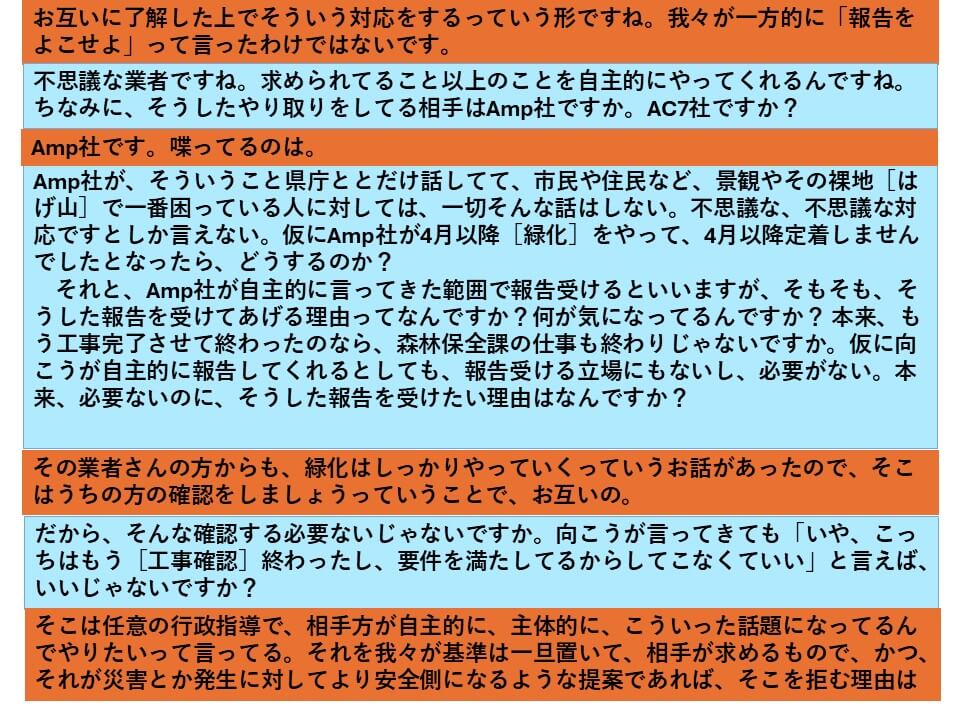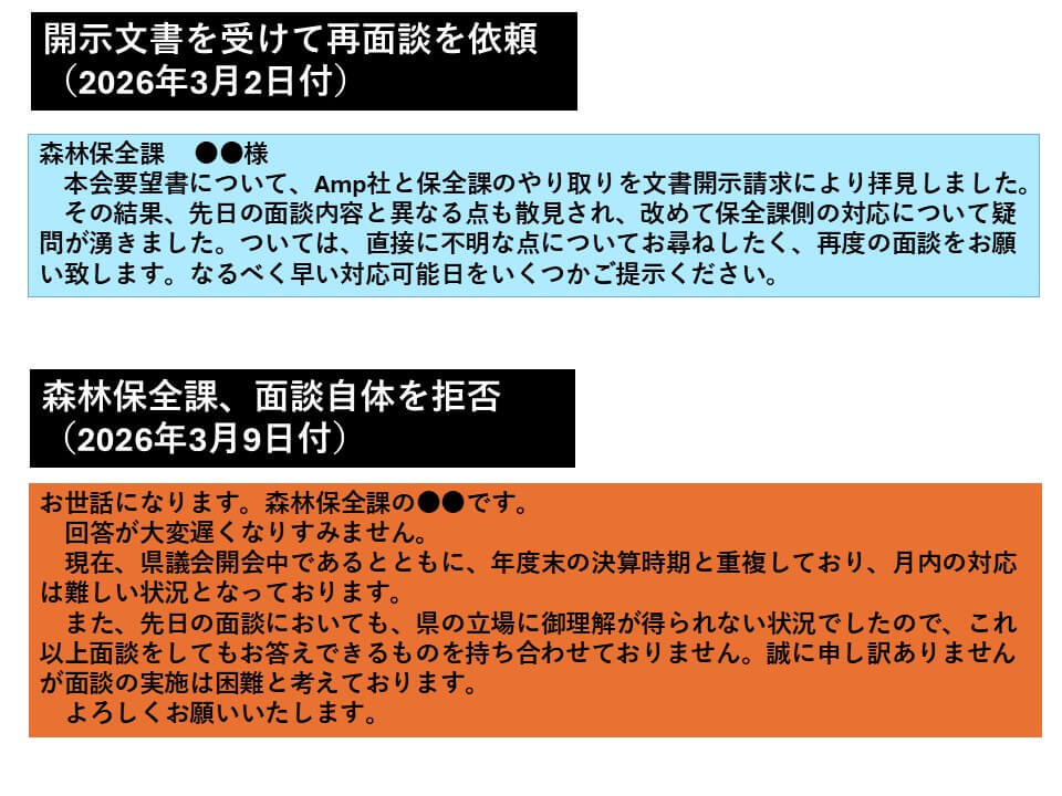 すでに本サイトで報じた通り、森林保全課は、本会からの要望・質問事項をすべてAmp社に丸投げして回答させています。