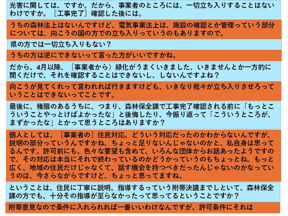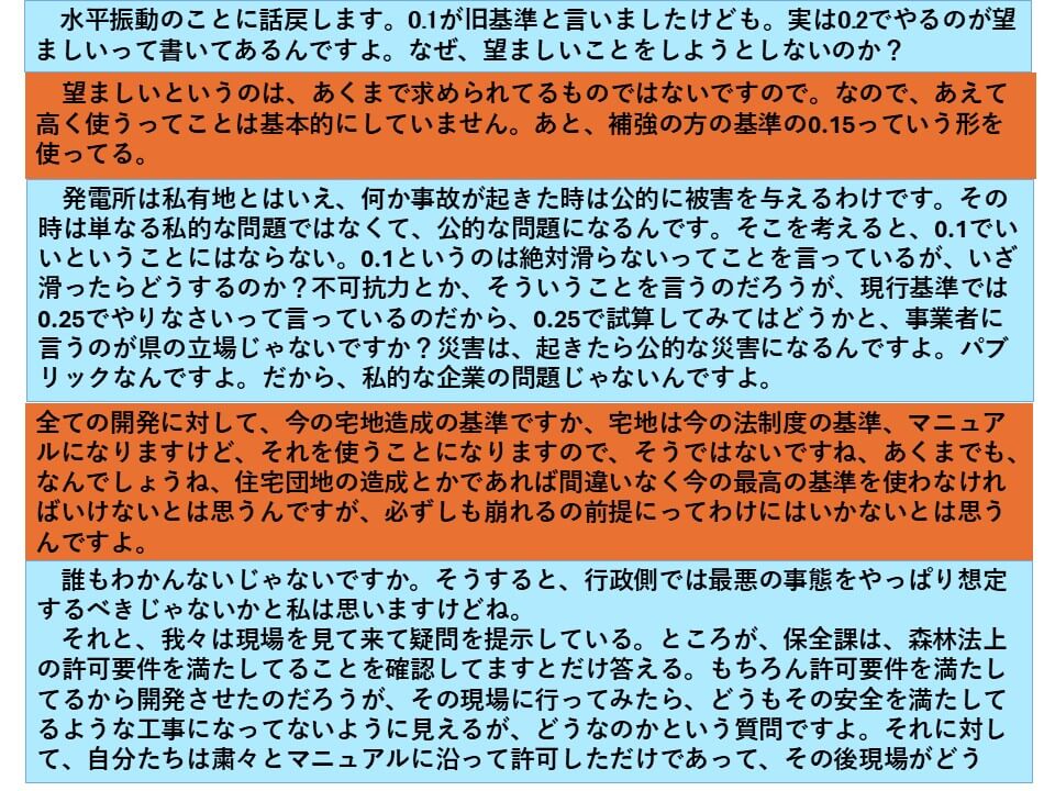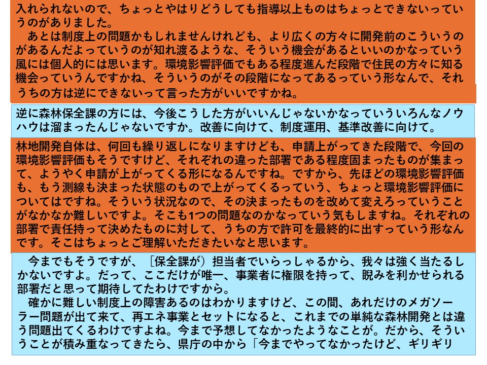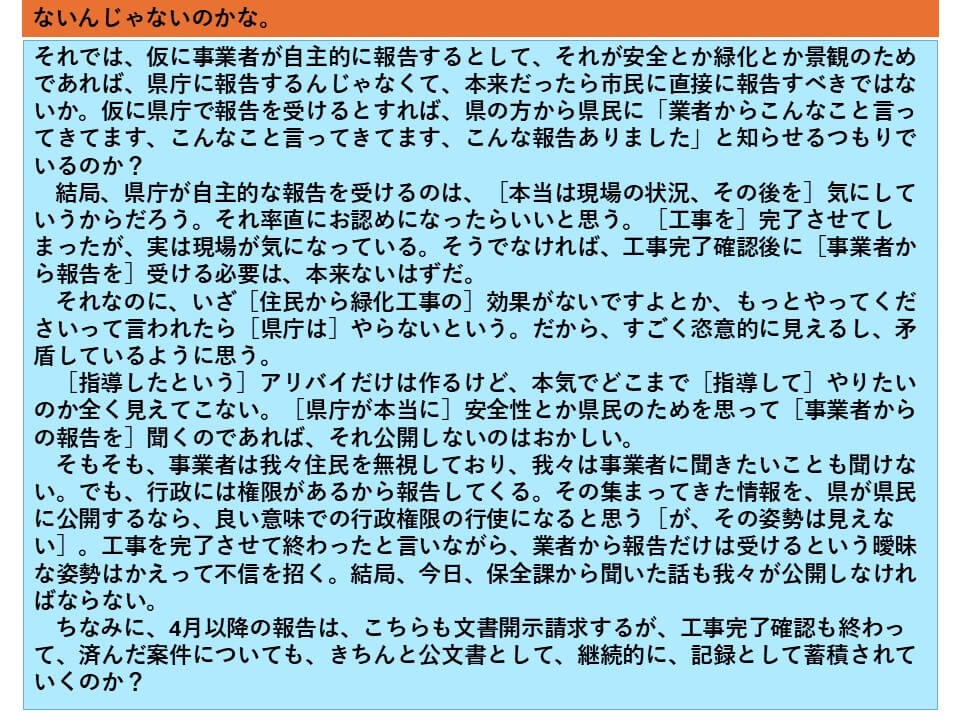 住民からの注視の視線が届かぬ先で、いつの間にか県庁が県民の意見や権利を擁護し、「公益」を守る仕事を忘れ、事業者の「私益」を優先する組織になり果てている可能性を警戒する必要があります。
