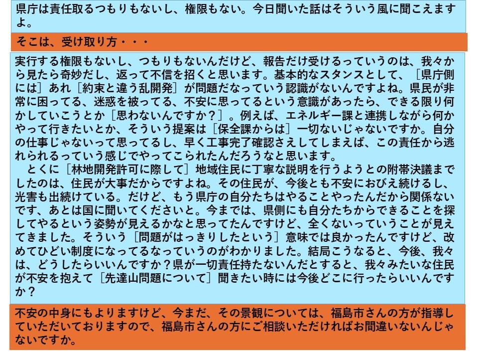 こうした県側の行政姿勢・方針については、本来であれば、県議会や県議、あるいはメディアによって議論されてしかるべき問題と思います。しかし、実際には、こうした事実はほとんど一般県民には知らされておらず、その結果、県民の中には、知事や県庁が先達山問題について何らかの対応策を講じてくれるのではないかと期待する向きもあります。しかし、以下の面談記録を読み、県庁の「仕事の流儀」を理解すれば、そうした期待がいかに淡く虚しものであるかお分かりになるでしょう。福島県庁の論理は、市民の論理とは全く異なっております。そして、行政担当者の視線は基本的に県民ではなく、県庁内部と事業者にに向いているのです。こうした県庁のありのままの姿を直視したうえで、我々は次なる行動を考えていく必要があります。