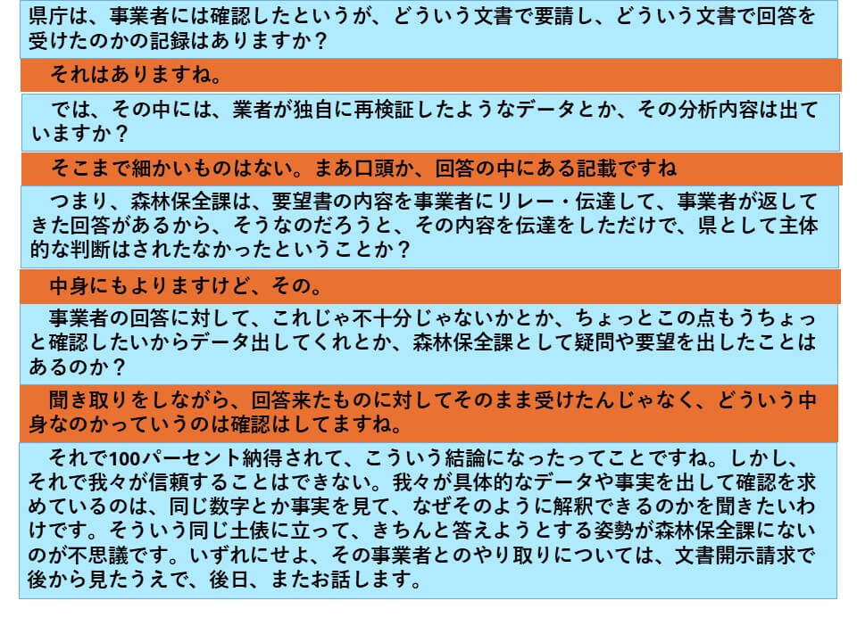 冒頭でも触れた通り、今回の面談は、上記の回答書の内容があまりにも乏しかったため、本会はこのような杜撰回答がいかなる経緯で生まれてきたのかを確認すべく、県庁側の窓口部署である森林保全課に直接の面談を申し入れたのです。