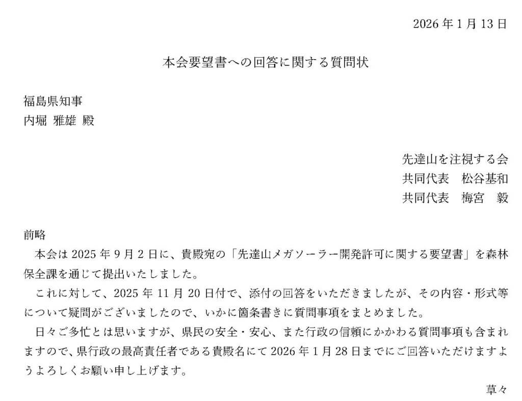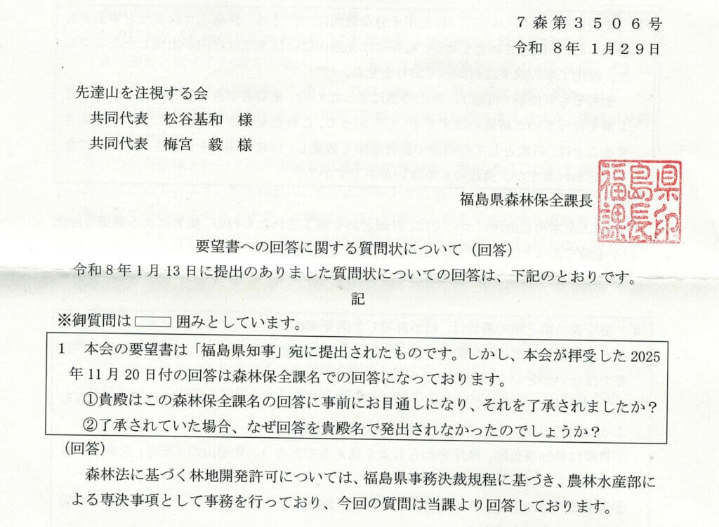 そこで、本会では、この回答は形式面でも内容面でも問題があるとして、再度、福島県知事あてに県知事名で責任ある回答を求める質問状(26/1/13))を送りましたが、これに対しても、福島県は再度「保全課長名」で前回とほぼ変わらぬ内容の回答(26/1/20付)を返してきました。