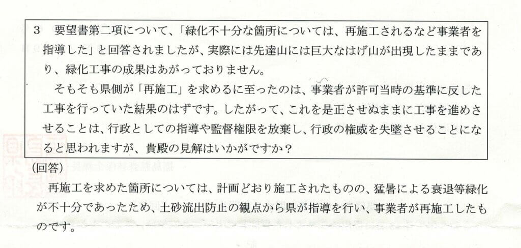 ここで県側は、事業者には緑化工事を進める義務があり、それが結果的に不十分であり、「土砂流出」等の危険性が生じることために、事業者に指導を行い、再施工させたことを認めます。