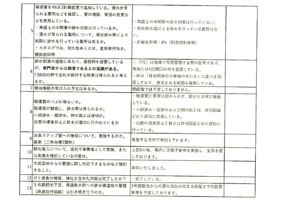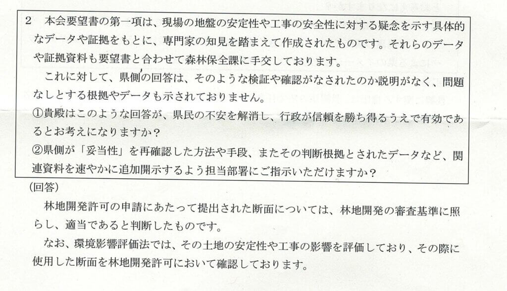 本会が県側に求めたのは、専門家から指摘された先達山の地盤や工事上の安全性の問題について、許可者である県自身の判断や、それに基づく適切な事業者への指導です。