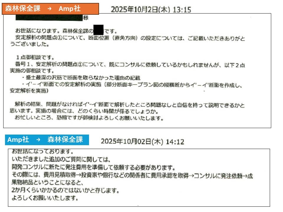 地すべりの危険性に関わる「安定解析」の問題については、保全課自身もAmpから回答に不安を覚えたようで、追加の解析をしてはどうかと提案もしています。