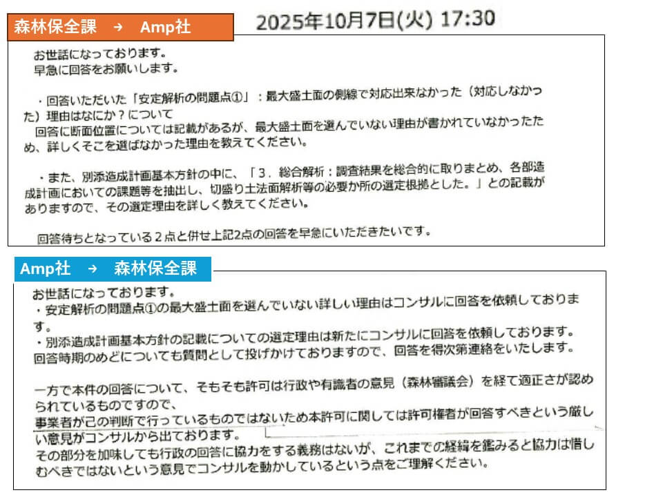 さらにミステリアスなのは、県庁はAmp社から出された回答案(=確認項目リストの記載事項)を大幅に削って、一段と中身の乏しい回答を作成してきたという点です。改めて 県知事宛要望書への森林保全課回答(25/11/20付)を見て頂ければ、ほとんど具体性もなければ、何ら技術的、専門的な事項には応えない内容になっていることが分かると思います。