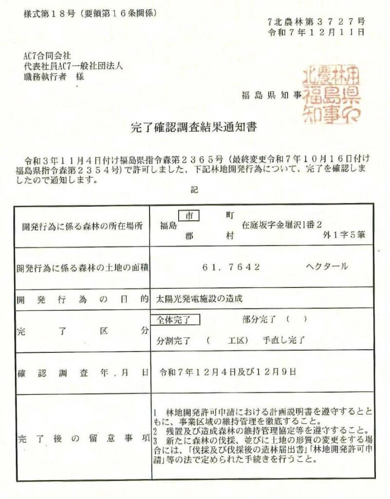 福島県知事が許可した開発案件は、福島県知事の名をもって、すでに「完了確認」されているのです。