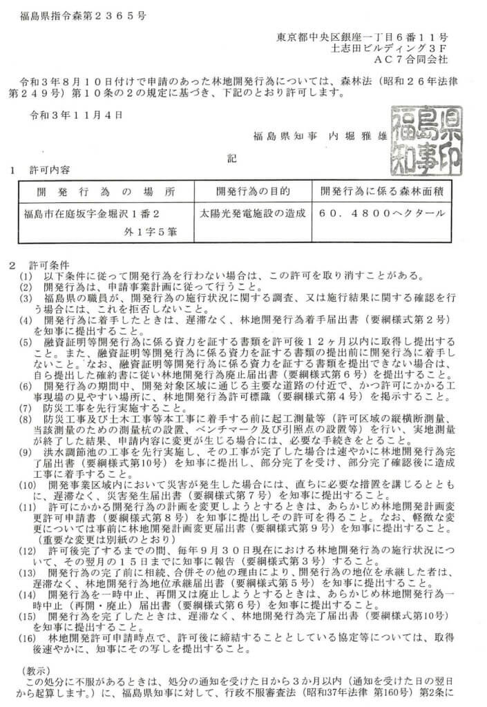 左は、AC7社に対して、福島県知が与えた林地開発許可の写しです。