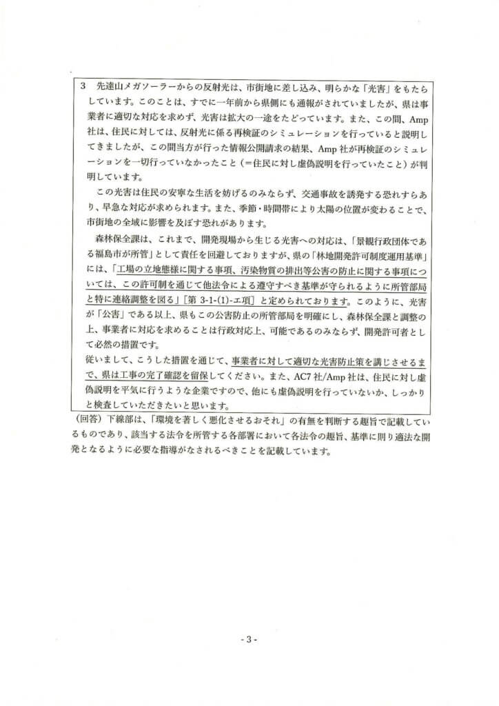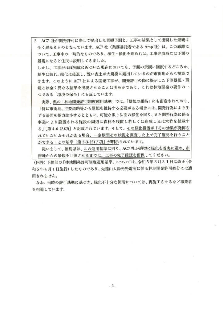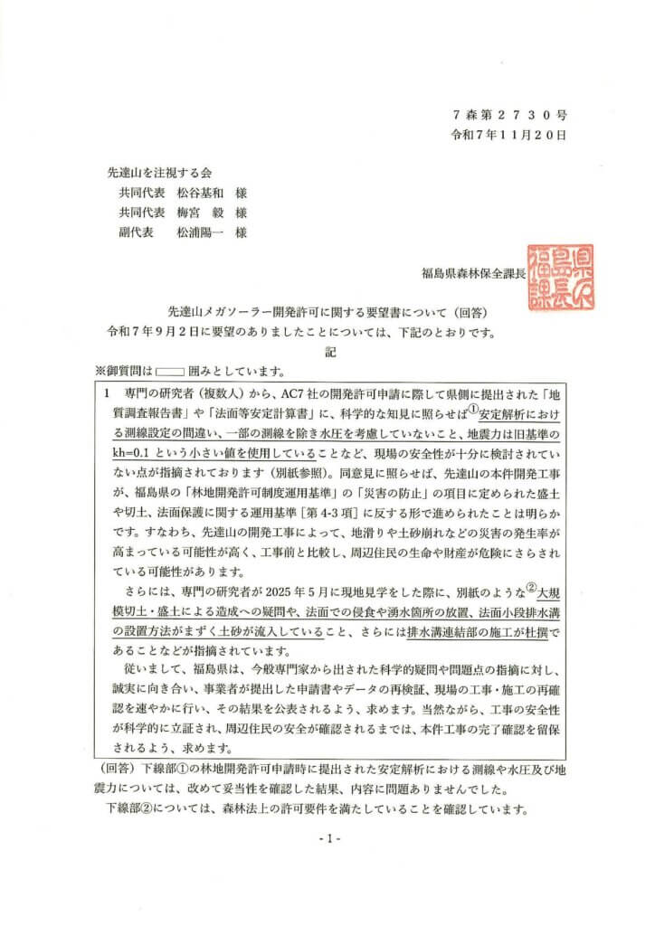 以下で紹介するのは、本会が2025年9月2付で提出した福島県知事あて要望書に対する福島県森林保全課からの回答です。福島県は、この中身の薄い回答をするまでに、3カ月近くも時間を費やし、その間に事業者は要望書内の懸念事項に一切対応することなく、商業運転=売電を開始(2025年9月30日)しました。こうした県庁側の回答遅延やタイミングを考えると、県側には売電開始を急がせ、既成事実化するのを間接的に後押ししたい意図があったのではないかとの疑念も生じるほどです。