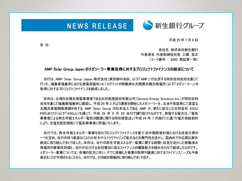この時、新生銀行は、Amp社が福島市東部にある太陽光発電事業を買収するための融資を行いました。